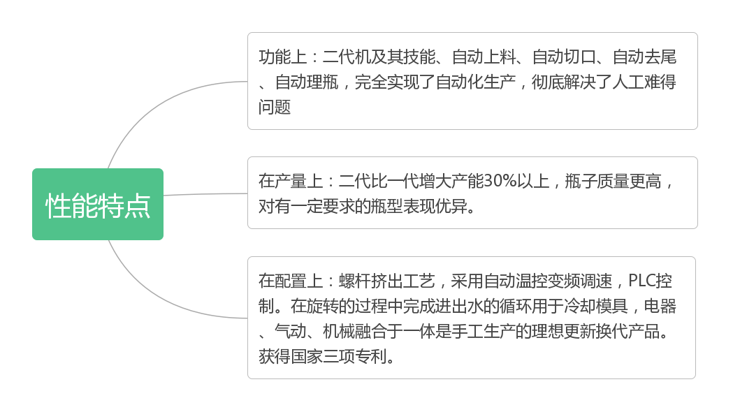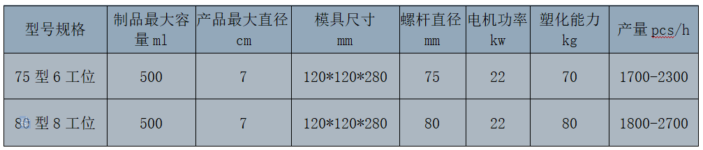 此機型主要適合于500ml以下,PE/PP原料的各種塑料瓶及軟管產(chǎn)品,如:棒棒冰、炸藥筒、花盆營(yíng)養缽、眼藥水瓶、果凍、果奶瓶、農藥瓶、醫藥瓶等產(chǎn)品。日產(chǎn)3萬(wàn)--12萬(wàn)之間。