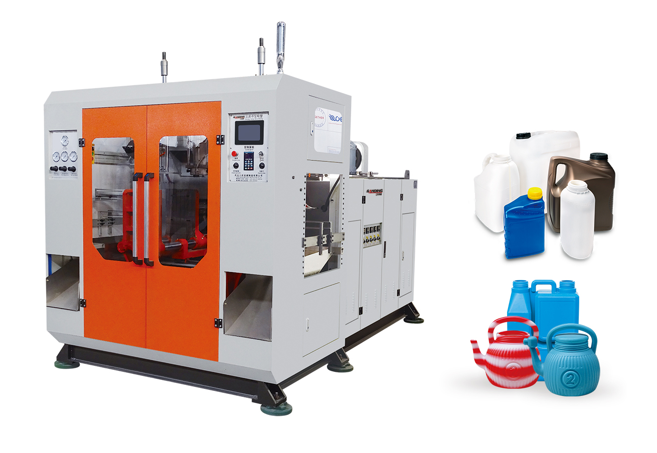 此機集擠出、合模、吹氣、脫模、切口、去料尾為一體實(shí)現了真正的全自動(dòng)。原料PE、PP等。主要有PLC和人機介面組成,彩色觸摸式操作屏,自動(dòng)上料系統。機頭有單、雙、三、四、五模頭。采用氣動(dòng)機械鎖模。高效節能。